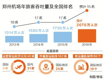 據(jù)鄭州機(jī)場相關(guān)負(fù)責(zé)人介紹,2014年鄭州機(jī)場旅客吞吐量突破1580萬人次,同比增長20%,增速位居全國20個大型機(jī)場首位。